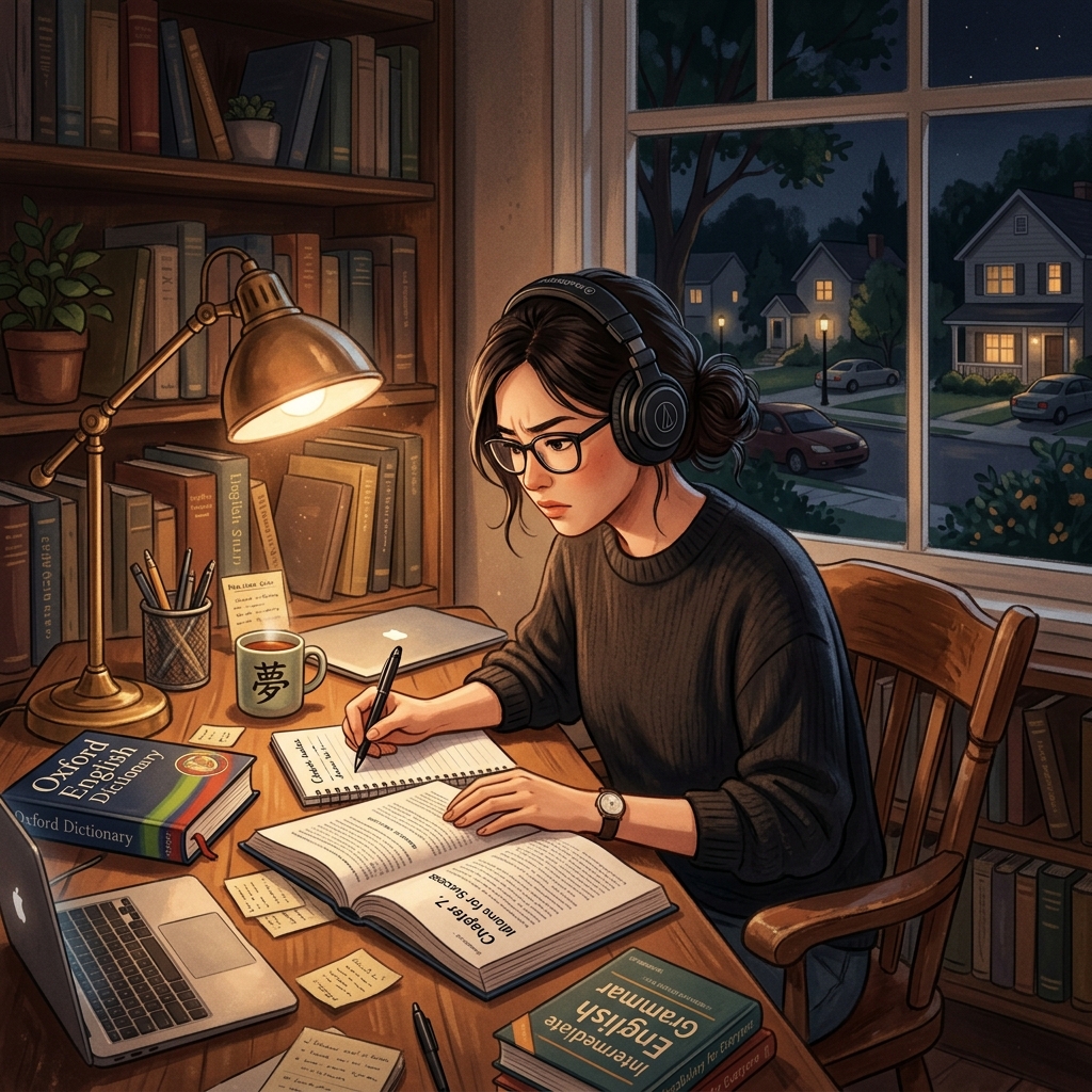 オンラインスクールを探し、一人で始めました。乳児の昼寝の時間、夜中の隙間時間を使って、一日5時間。学習時間が1000時間を超えた頃、急にフレーズごと聞き取れるようになりました。前置詞まで。全部。英語の勉強が——楽しくなりました。